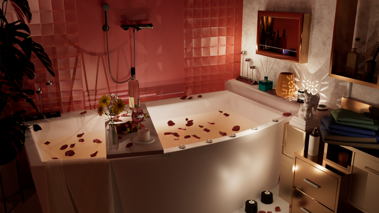 A tiring week of work is finally over. On a Saturday night, open a bottle of white wine and enjoy the time surrounded by the aroma of roses, accompanied by soft music and dim candlelight. I tried building my bathroom in C4D, and I thought it was a moment of relaxation and delight worth recording.